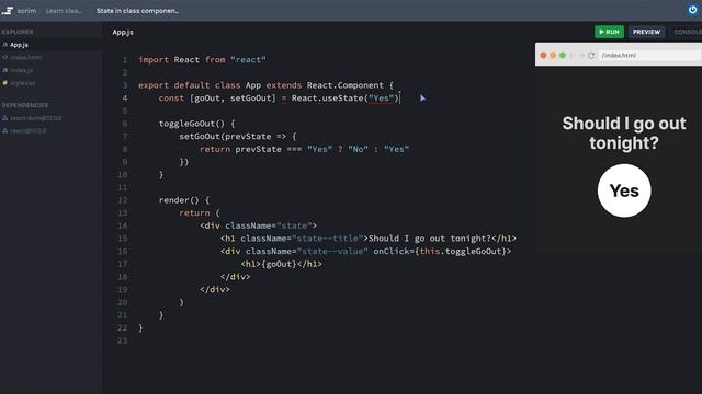 Let's see how we can take a stateful functional component and turn it into a stateful class component. ? Play with this code on Scrimba: https://scrimba.com/learn/classcomponents/ ? Check out Scrimba’s interactive learning platform: https://scrimba.com/ ? Linktree: https://scrimba.com/links/linktree
