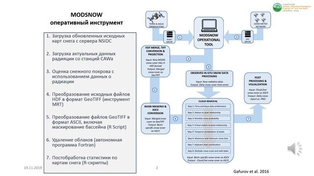 Видео-курс подготовлен в рамках проекта CAMP4ASB, реализуемый Региональным экологическим центром Центральной Азии при финансовой поддержке Всемирного Банка. Данный вебинар посвящен теме гидрологического прогнозирования на основе инструмента МОДСНОУ. Инструмент МОДСНОУ, разработанный г-ном Аброром Гафуровым, применяет методологию использования данных дистанционного зондирования по снежному покрову для гидрологического прогнозирования в Центральной Азии. Данный видео курс состоит из семи глав, которые описывают этапы применения данных дистанционного зондирования о снежном покрове для гидрологического прогнозирования.