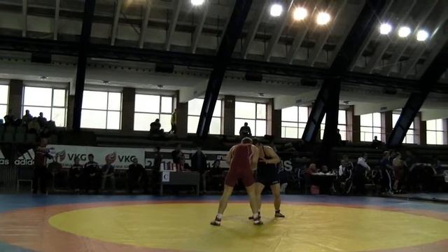 Bryting Greco-Roman wrestling. .Fredrik S.Morsund,NOR(red)&Leons Morozovs.Latvia. 2 periode. Kaleva Sportshall, Tallin Estland.