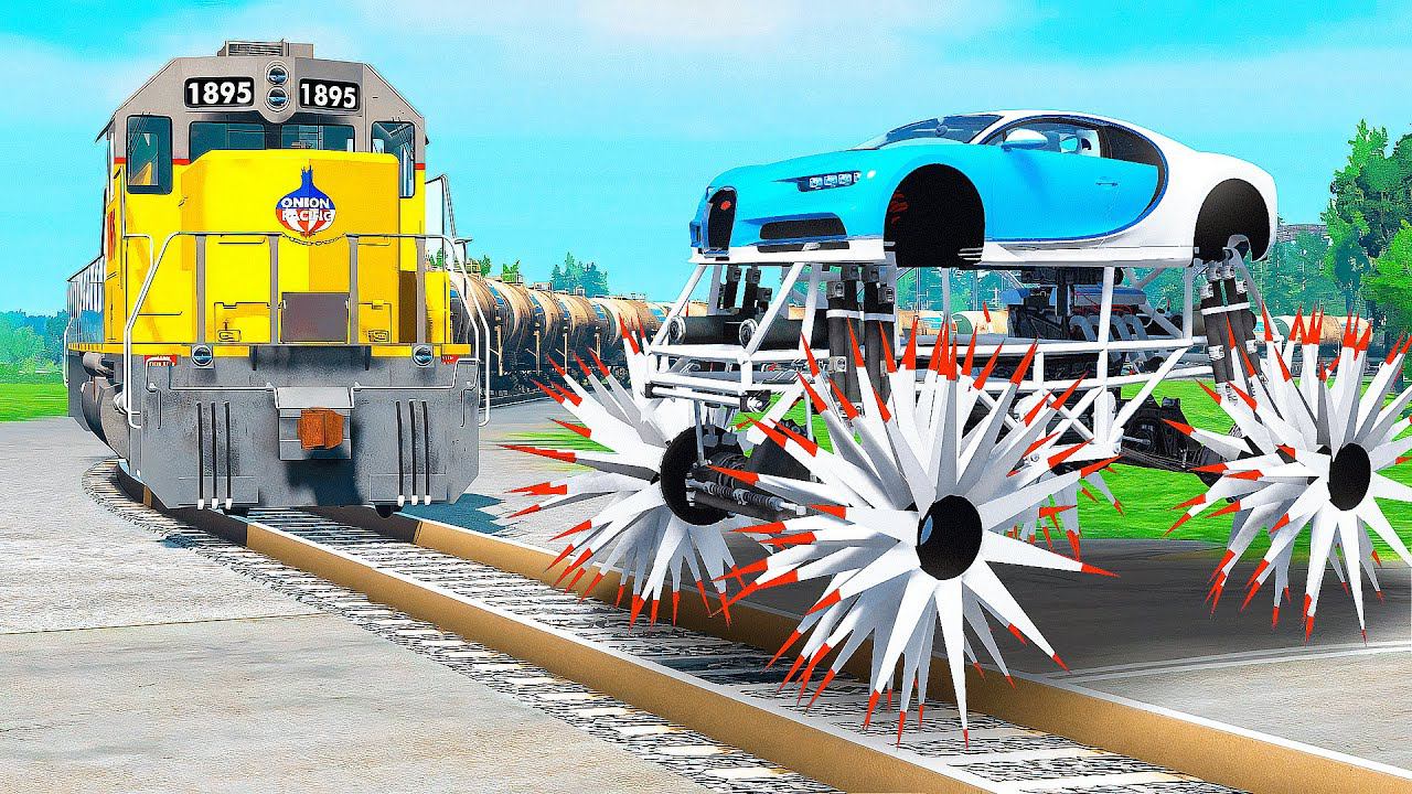 ПРОЕХАЛ РЕЛЬСЫ на ГИГАНТСКОЙ БУГАТТИ на КОЛЮЧКАХ в ГТА 5 МОДЫ - ЭКСПЕРИМЕНТЫ в GTA 5 MODS