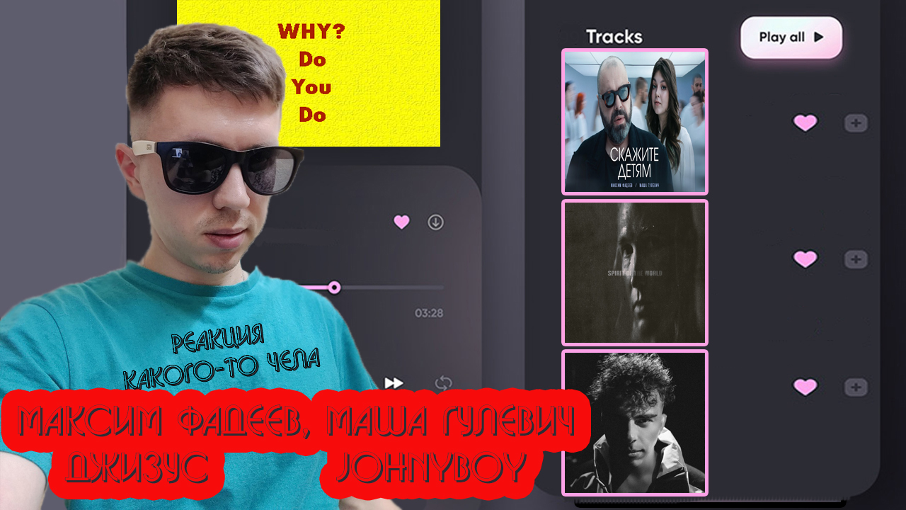 Ccылка на телеграм-канал https://t.me/whydoyoudo_official Поддержать канал, если есть желание - через Donationalerts https://www.donationalertsCcылка на телеграм-канал https://t.me/whydoyoudo_official Поддержать канал, если есть желание - через Donationalerts https://www.donationalerts.com/r/whydoyoydo Заказать реакцию: на трек-50 руб; на альбом: до 15 треков-200 руб, до 25 треков - 300р, более 25 треков- 500р (АНТИХАЙПТРЕЙН-1000р) ; на баттл до 30 мин-200р, более 30 мин-300р (в сообщении с донатом указывайте названия треков, альбомов, баттлов). Оригинал источника https://www.youtube.com/watch?v=aZ2fnI1_oUA https://www.youtube.com/watch?v=ms4TcNSvU-Q https://www.youtube.com/watch?v=QMisjsmOeNs Подписка на канал обязательна, если хотите больше развлекательного контента в своей жизни. Таймкоды: 00:00 Вступление 00:35 Максим Фадеев, Маша Гулевич 09:10 Джизус 15:50 Джонхибой Данное видео создано исключительно в развлекательных целях и не имеет цели оскорбить или опорочить кого либо. Использование видеофрагментов соответствует статье №1274 Гражданского Кодекса РФ и не противоречит доктрине о добросовестном использовании США: цитирование любого материала возможно в научных, полемических, критических или информационных целях с указанием источника, автора или правообладателя..com/r/whydoyoydo Заказать реакцию: на трек-50 руб; на альбом: до 15 треков-200 руб, до 25 треков - 300р, более 25 треков- 500р (АНТИХАЙПТРЕЙН-1000р) ; на баттл до 30 мин-200р, более 30 мин-300р (в сообщении с донатом указывайте названия треков, альбомов, баттлов). Оригинал источника Подписка на канал обязательна, если хотите больше развлекательного контента в своей жизни. Данное видео создано исключительно в развлекательных целях и не имеет цели оскорбить или опорочить кого либо. Использование видеофрагментов соответствует статье №1274 Гражданского Кодекса РФ и не противоречит доктрине о добросовестном использовании США: цитирование любого материала возможно в научных, полемических, критических или информационных целях с указанием источника, автора или правообладателя.