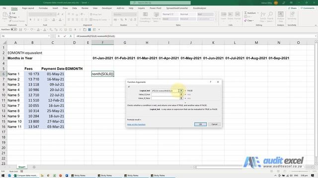 00:00 Compare dates (month and year only, the day is irrelevant) 00:20 Build an IF function that compares the dates 00:55 Use EOMONTH to make all dates have the same day, month & year to compare 01:47 Explaining EOMONTH in more detail How to easily compare 2 dates where you are only concerned about the month and year matching, the day is not important in this case. This is a much easier way then building an AND function into an IF function.