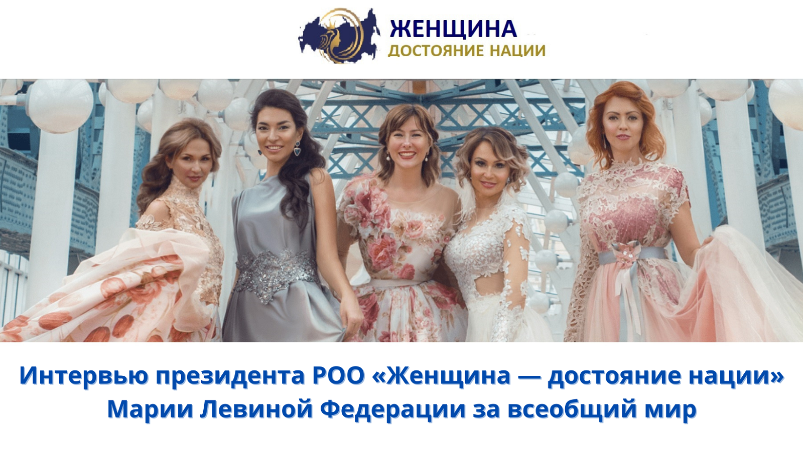 Поздравляем Марию Левину, руководителя РОО "Женщина – достояние нации", с присуждением почетного звания "Посол мира". В интервью Федерации за всеобщий мир Мария Левина поделилась целями, которые она преследует в рамках своей активной общественной деятельности: духовно-нравственное и культурное развитие женщин; укрепление семейных ценностей; возрождение общечеловеческих ценностей; улучшение демографической ситуации в стране; просветительская работа с молодежью. Также в ходе интервью были представлены следующие проекты: "Современный институт благородных девиц", "Успешное будущее детей России", "Эстетическое воспитание", "Международный конкурс красоты и достоинства 'Белая королева'". Некоторые из этих проектов будут реализовываться в партнерстве с Федерацией за всеобщий мир. Это особенно ценно в рамках 2024-го года, который объявлен в нашей стране, как Год семьи.