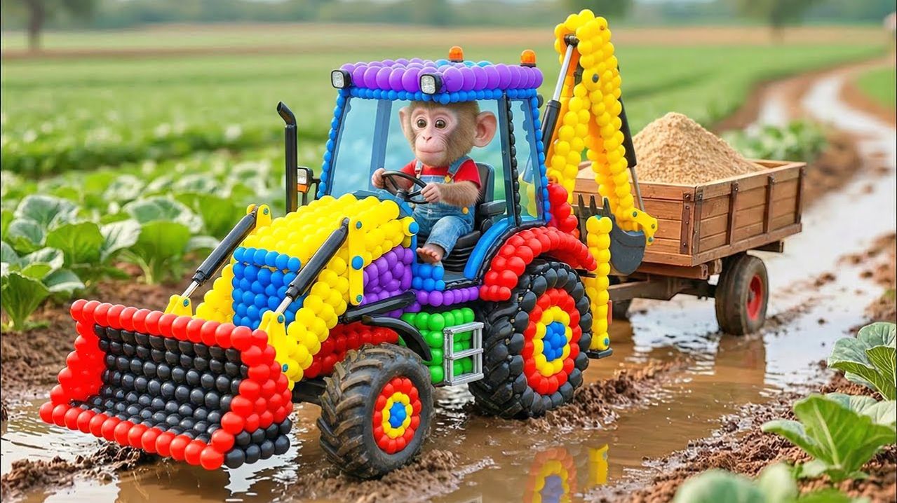 ОБЕЗЬЯНКИ ДЕТЯМ НАНА КОРМИТ ЦЫПЛЯТ И СОБИРАЕТ ЯБЛОКИ ФЕРМА ТРАКТОР ЭКСКАВАТОР СИНИЙ ТРАКТОР