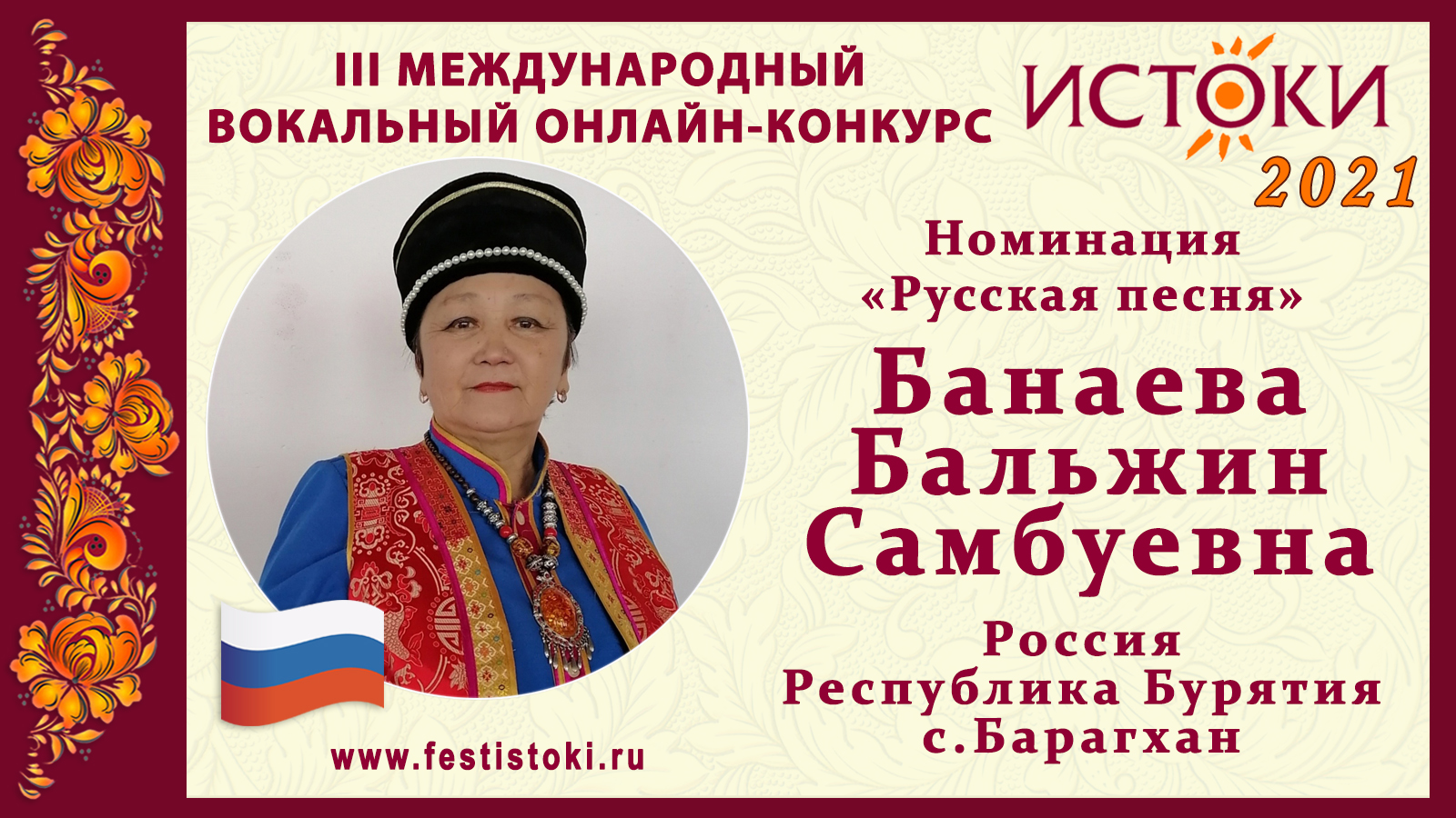 Дипломант III Международного вокального онлайн-конкурса «Истоки». Номинация "Русская песня". Песня "Деревенька русская" (авторская). Слова - Ольга Пальк и Андрей Соболь. Музыка и аранжировка - Артур Бродский. Сайт: www.festistoki.ru / www.festistoki.com E-mail: festistoki@mail.ru