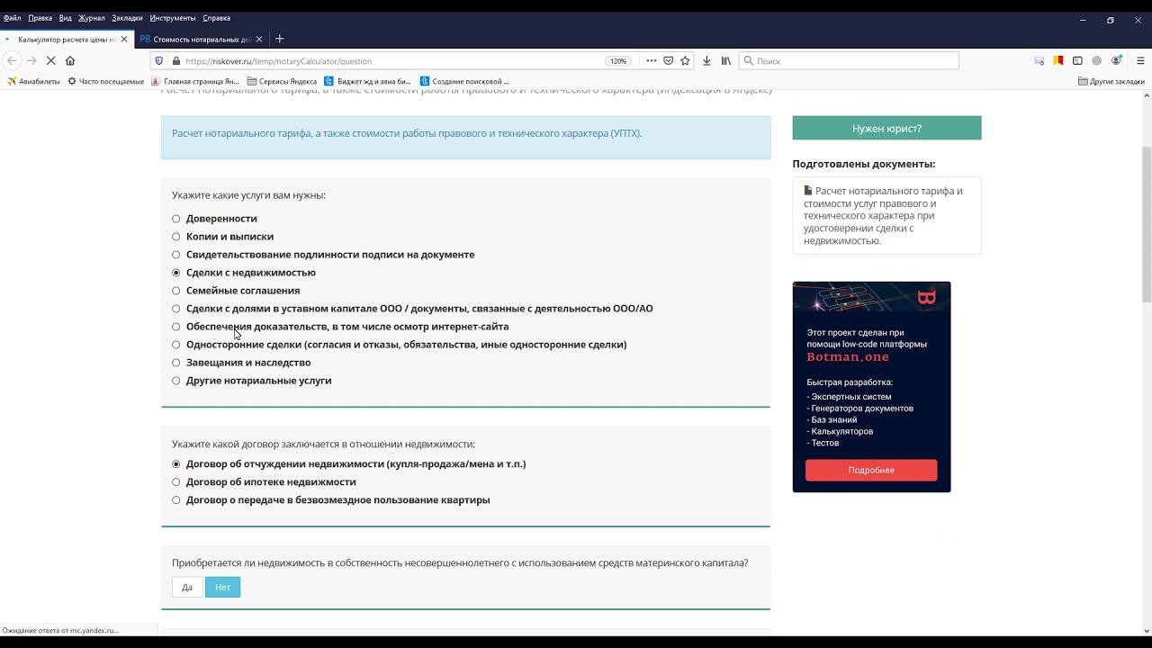 Калькулятор цены нотариальных услуг, без кодинга в визуальном low-code конструкторе Botman.one