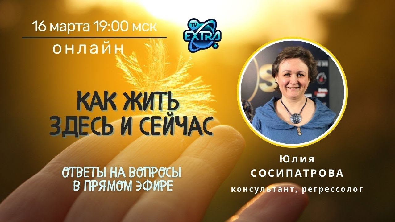Тема встречи: Как жить здесь и сейчас?. Серия Консультаций в Прямом Эфире. Запись от 16 марта 2023 года В формате Открытой Встречи ответы на вопросы участников об актуальных темах нашей действительности с точки зрения Души. Что не нужно и нужно делать сейчас? Как справляться с эмоциями? Где найти источник здравомыслия? Как жить и быть здесь и сейчас? Как обрести точку опоры и нужно ли ее искать или продуктивнее "плыть по течению" и принимать полученный опыт? Вопросы можно задавать в прямом эфире или заранее направлять на эл почту: info@probujdenie.ru Ответы на ваши вопросы о симптомах и причинах заболеваний. _____________________ Подробнее о специалисте и консультациях на персональной странице Юлии СОСИПАТРОВОЙ https://probujdenie.ru/persony/julia_sosipatrova/ Мастер-класс с Юлий Сосипатровой в рамках конференции НЕПОЗНАННОЕ "Практическая медитация по работе с препятствиями в жизни" https://probujdenie.ru/master-klassy-konferencii-nepoznannoe-v-zapisi/ ______________________ https://probujdenie.ru/qhht/dolores_cannon_qhht/ - официальное сертифицированное обучение методу Долорес Кэннон QHHT от Академии Долорес ____________ ✅ ПОЛЕЗНЫЕ ССЫЛКИ: Подписывайтесь на ТВ Экстра в Телеграм: https://t.me/nepoznannoe_online Подписывайтесь в группу ВК: https://vk.cc/clbZlF Получайте полезные материалы от лучших практиков школы "Пробуждение" https://vk.cc/clc8UR Запись на вебинары: https://probujdenie.ru/
