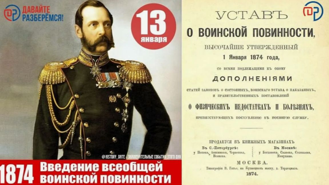 В России принят Устав о воинской повинности Устав действовал на территории России до января 1918 года (1) 13 января 1874 года Александр II утвердил «Устав о воинской повинности» и специальный манифест о нем