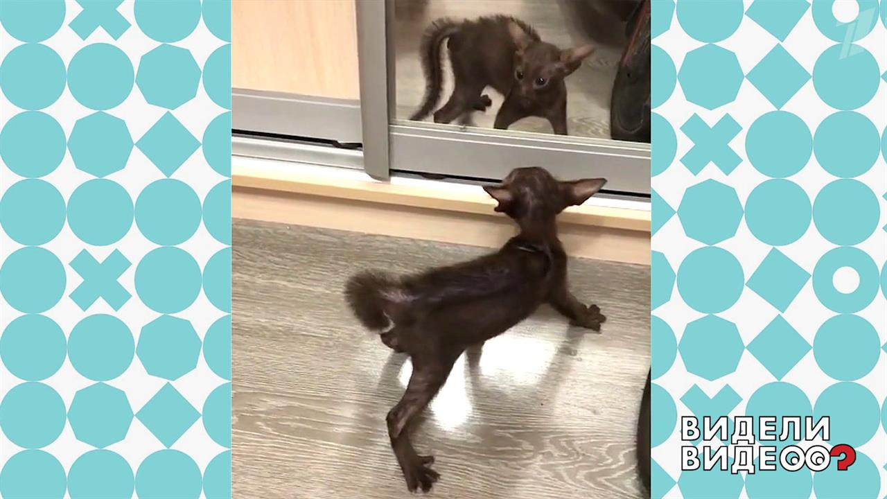 Котенок Ори впервые увидел себя в зеркале.