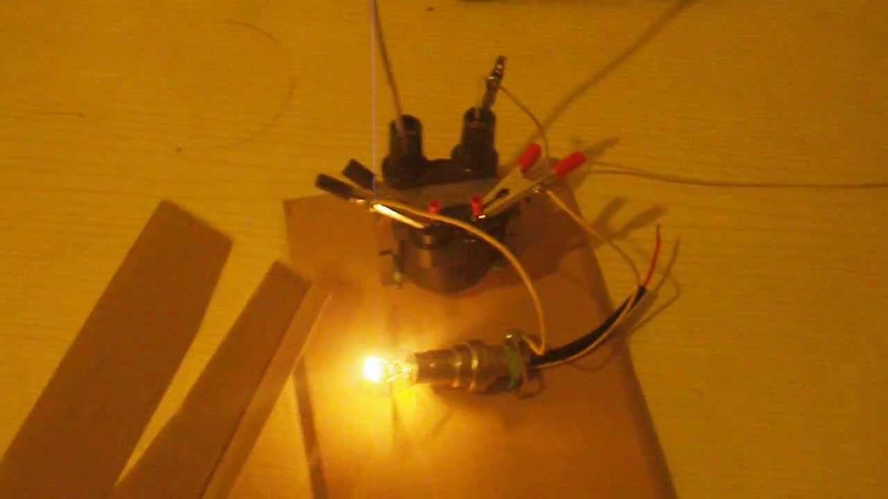 Передача электричества по одному проводу. Передатчик - качер Бровина на катушке зажигания (без сердечника). Приёмник - катушка зажигания (с железным сердечником), автомобильная лампочка на 12 вольт 5 ватт и антенна из куска толстого алюминиевого провода. Длина линии - около 7 метров. Ток везде высокочастотный.