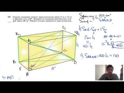 №231. Стороны основания прямого параллелепипеда равны 8 см и 15 см и образуют угол в 60°. Меньшая из площадей диагональных сечений* равна 130 см2. Найдите площадь поверхности параллелепипеда. Поддержать канал рублём - 5469400944002125 (Сбербанк) Мой второй канал для подготовки к ЕГЭ и ОГЭ - https://www.youtube.com/ЕвгенийСумин Инстаграм - https://www.instagram.com/EGE_OGE.math Личный инстаграм - https://www.instagram.com/ee_sumin VK - https://vk.com/evgeniysumin FB - https://www.facebook.com/EvgeniySumin