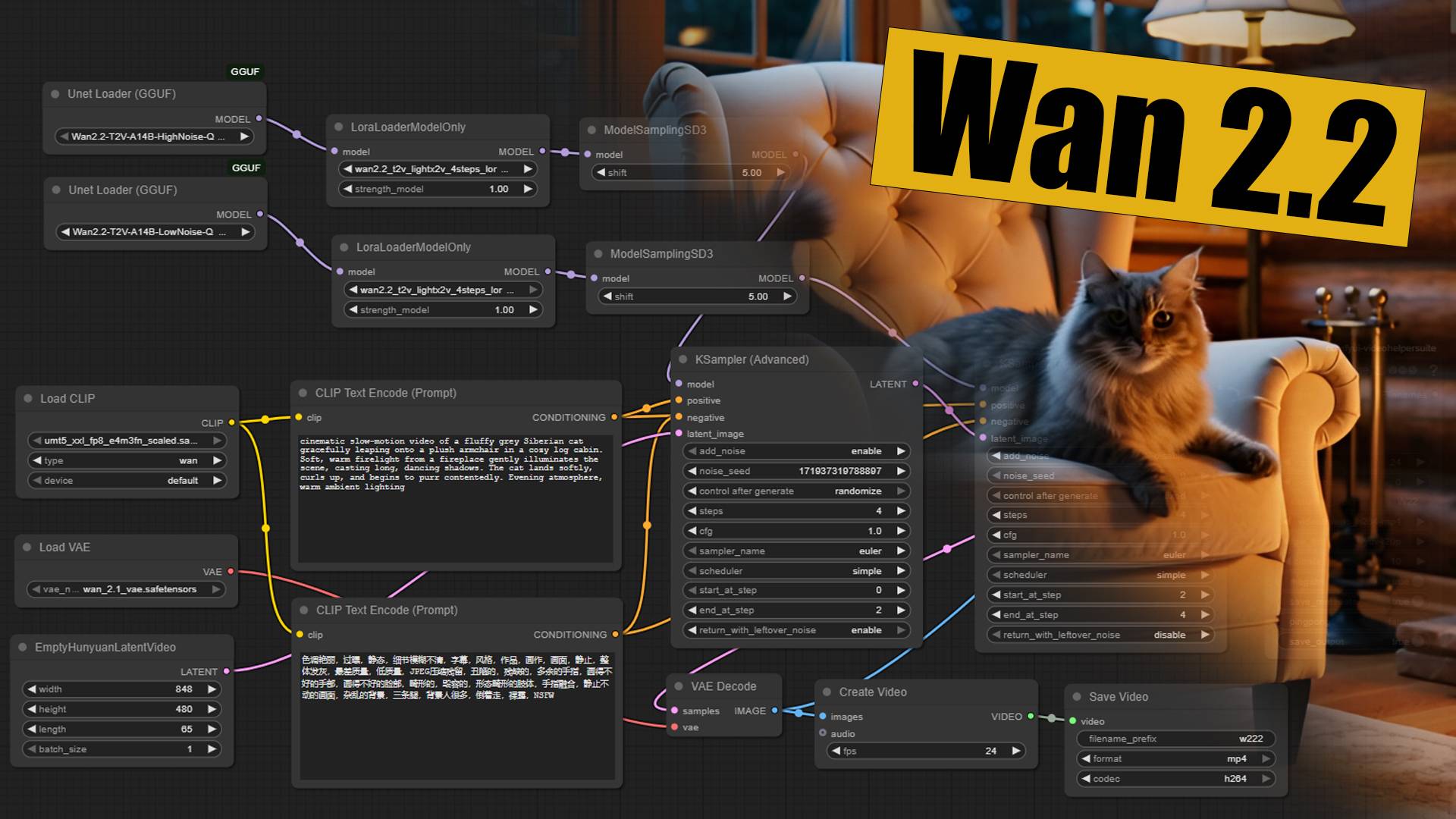 Всем привет! 1. Установить Comfy 2. Выбрать в Templates - Video - Wan2.2 3. Загрузить все, кроме моделей по 13гб 4. В Менеджере нод Comfy загрузить Unet GGUF 5. Скачать квантмодели по ссылке (High и Low Q4.0): https://huggingface.co/QuantStack/Wan2.2-T2V-A14B-GGUF/tree/main 6. Переместить скаченные модели в папку ComfyUI\models\unet 7. Скачать шаблон WorkFlow: https://disk.yandex.ru/d/iDLLsHZTnB4wnQ 8. Открыть WorkFlow Wan 2.2 t2v и сохранить его. ----------------------------------- 9. Написать позитивный промт, выбрать разрешение и количество кадров 10. Генерить ----------------------------------- С уважением, Расуль Загретдинов Поддержать канал: https://new.donatepay.ru/@oktaro