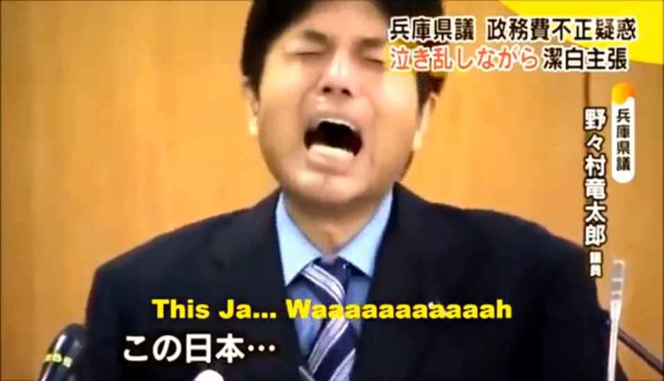 Клип с плачущим и бьющим по столу японским политиком Рютаро Нономурой, которого осудили за нерациональное использование государственных средств. Источник: http://w-o-s.ru/
