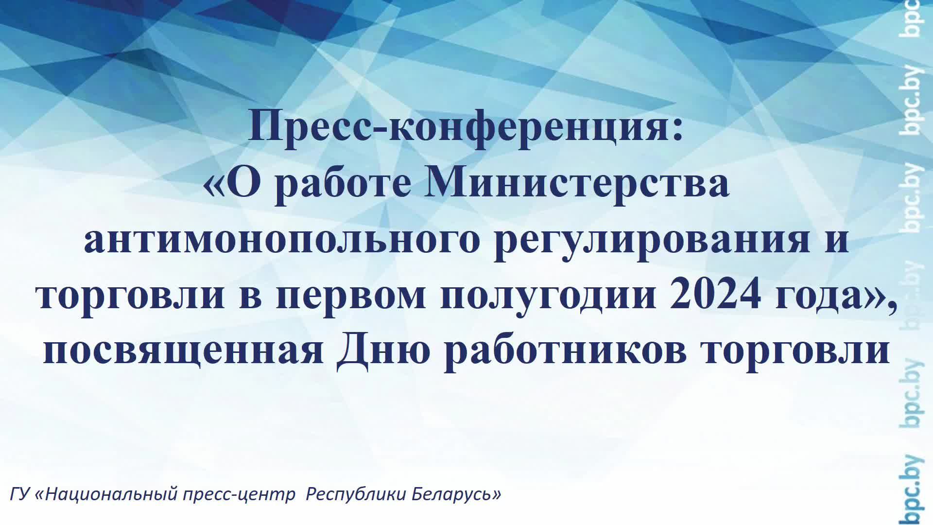 Пресс-конференция: «О работе Министерства антимонопольного регулирования и торговли в первом полугодии 2024 года», посвященная Дню работников торговли Богданов Алексей Игоревич – министр антимонопольного регулирования и торговли Республики Беларусь, Мельникова Наталья Викторовна - начальник управления организации торговли и общественного питания МАРТ, Ивановская Ирина Викторовна - начальник аналитического управления МАРТ, Шаблинская Наталия Сергеевна - исполнительный директор некоммерческого объединения «Ассоциация розничных сетей» Задать вопрос: vopros@bpc.by Вся самая актуальная и оперативная информация о пресс-мероприятиях Национального пресс-центра Республики Беларусь будет публиковаться на нашем телеграм-канале. Подписывайтесь на нас: https://t.me/s/belpresscenter