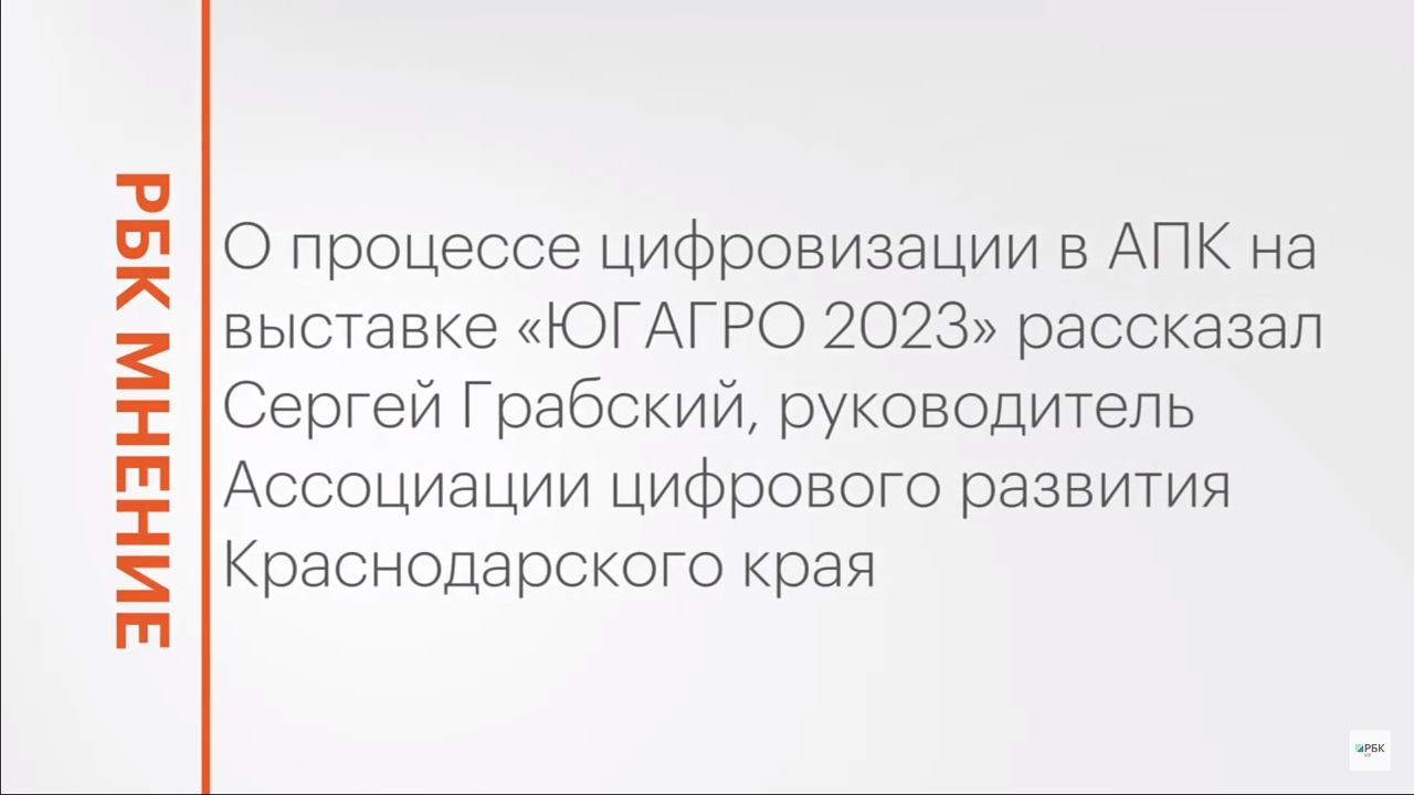 О процессе цифровизации в АПК на выставке «ЮГАГРО 2023» рассказал Сергей Грабский, руководитель Ассоциации цифрового развития Краснодарского края. Подписывайтесь на нас в социальных сетях: ВКонтакте: https://vk.com/rbcyug Telegram: https://t.me/rbc_krasnodar, https://t.me/rbcrostov, https://t.me/rbc_kavkaz Подпишитесь на канал РБК Юг, чтобы смотреть новые выпуски первыми!