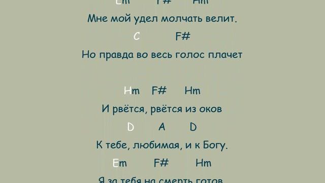 Вадим Никитин (камышин) СПЕШУ СКАЗАТЬ 2011г Тебе я правду говорю, Которую скрывать бы надо, Скрывать, что каждую зарю Хочу встречать с тобою рядом, Встречать, припав к твоим устам, Прильнув к груди твоей, к ладоням. Я правду сразу всю отдам. По капле боязно – утонем. От капель тает и гранит. А сердце мягкое – тем паче. Мне мой удел молчать велит. Но правда во весь голос плачет И рвётся, рвётся из оков К тебе, любимая, и к Богу. Я за тебя на смерть готов, А надо жить – светло и строго, И значит, наложить печать На правду эту, птицу боли. Её до истины поднять, До Неба можно лишь в неволе. вместо F# лучше F#m Hm F# F#7 Hm Тебе я правду говорю, Hm Fm Hm Тебе я правду говорю, * * * наигрыш: Hm7 52,32,(22-23),32,22,32,12,62,-начало 52 и тд Hm F#m Hm Тебе я правду говорю, D A D Которую скрывать бы надо, Em F# Hm G Скрывать, что каждую зарю C F# Хочу встречать с тобою рядом, Hm A D Встречать, припав к твоим устам, A D Прильнув к твоей груди , к ладоням. C F# Hm G Я правду сразу всю отдам. C F# По капле боязно – утонем. (Hm?)F# F# Hm От капель тает и гранит. D A D А сердце мягкое – тем паче. Em F# Hm G Мне мой удел молчать велит. C F# Но правда во весь голос плачет Hm F# Hm или- Hm A D И рвётся, рвётся из оков D A D или A D К тебе, любимая, и к Богу. C F# Hm G Я за тебя на смерть готов, C F# А надо жить – светло и строго, Hm A D И значит, наложить печать A D На правду эту, птицу боли. C F# Hm G Её до истины поднять, C F# До Неба можно лишь в неволе. повтор: Hm A D G Её до истины поднять, Em F# Hm До Неба можно лишь в неволе. 52 наигр: Hm7 52,32,(22-23),32,22,32,12,62,-начало 52 и тд или: Em A D G Её до истины поднять, Em F# Hm До Неба можно лишь в неволе. На стихи Вадима Никитина 2011г. Первая проба от Ю.Валикова 2023-09-10