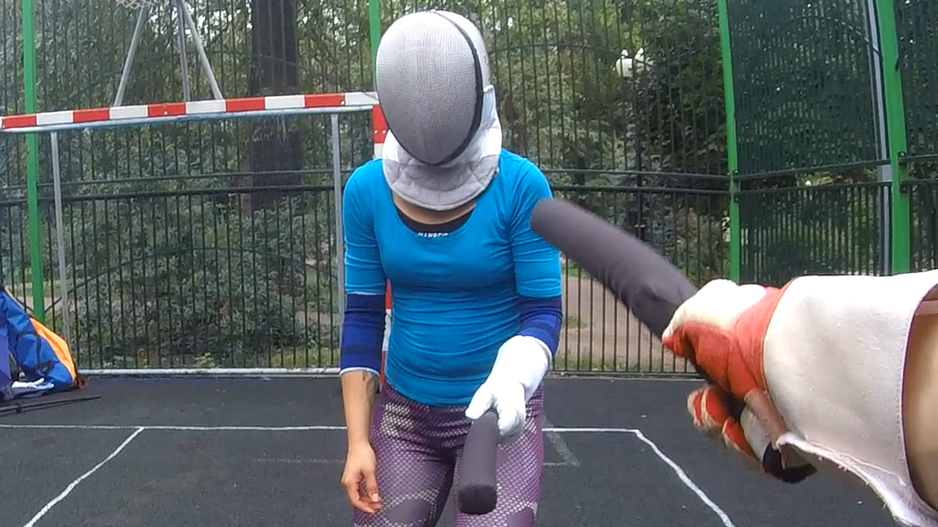 Урок фехтования катаной в школе кендзюцу - спарринг на коротких мечах летом на улице