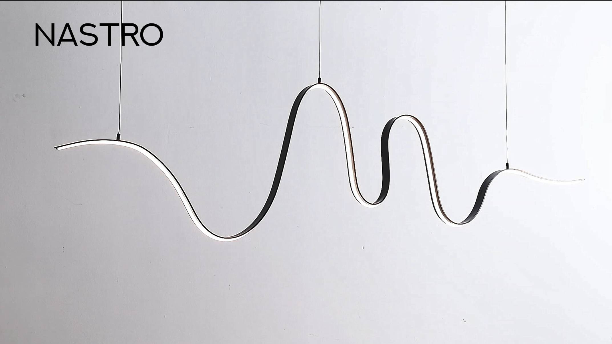 Минималистичный светильник NASTRO выполнен в виде волны, формирует контрастный минималистичный силуэт в пространстве. Рекомендуется использовать не на большой высоте.