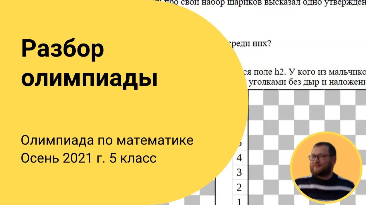 Ответ и решение задач Осенней олимпиады по математике для 5 класса 2021 года, которая прошла 24 октября 2021 года. Записаться на очередную олимпиаду — https://systematika.org/olimpiada/math/ Онлайн-занятия в мини-группах По одному абонементу можно заниматься сразу в нескольких кружках. Олимпиадная математика для 1–9 классов — https://systematika.org/online-courses/live-math/ Шахматы для 1–9 классов — https://systematika.org/online-courses/chess/ ТРИЗ для 1–7 классов — https://systematika.org/online-courses/triz/ Биология для 3–7 классов — https://systematika.org/online-courses/biology/ Индивидуальные занятия Опытные преподаватели из лучших вузов России помогут достичь высоких результатов в обучении! Олимпиадная математика — https://systematika.org/online-courses/live-math-repetitor/ Школьная математика — https://systematika.org/online-courses/school-math-repetitor/ Шахматы — https://systematika.org/online-courses/chess-repetitor/ ТРИЗ — https://systematika.org/online-courses/triz-repetitor/ Биология — https://systematika.org/online-courses/biology-repetitor/ Химия — https://systematika.org/online-courses/chemistry-repetitor/ Физика — https://systematika.org/online-courses/physics-repetitor/ Курсы Выбирайте только те темы, которые интересны вам. Олимпиадная математика — https://systematika.org/items/matematika/ Программирование — https://systematika.org/items/programmirovanie/ Физика — https://systematika.org/items/fizika/ История — https://systematika.org/items/istoriya/ Шахматы — https://systematika.org/items/shahmaty/ Soft skills — https://systematika.org/items/soft-skills/ Более 150 курсов в записи и вживую на сайте — https://systematika.org/form/courses/