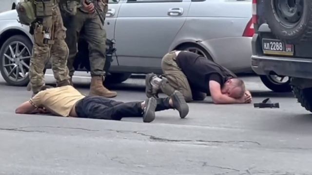 Люди в форме со знаками отличия ЧВК Вагнер уложили на асфальт двух человек возле штаба ЮВО в Ростове