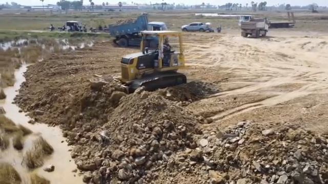 засыпке Огромного поля земли с помощью бульдозера Komatsu D31PX, который толкает почву, смешивает ка
