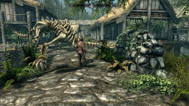 Skyrim. Вор смотрит на скелет дракона