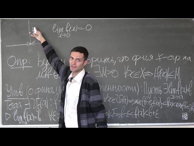 00:00 – Вводное слово 1:10 - Утверждение единственности предела функции +док-во 3:22 - Определение функции ограниченной на множестве 4:47 - Утверждение о финальной ограниченности функции, имеющей предел +док-во 12:00 - Пример 15:08 - Ввод в тему лекции (Односторонние пределы) 17:30 - Определение правого(левого) предела функции по Коши 22:30 - Определение правого(левого) предела функции по Гейне 27:12 - Пример 1 функция сигнум 33:24 - Утверждение Предел функции существует тогда и только тогда, когда существуют правый и левый пределы, причем они равны + доказательство 39:44 - Лемма (О сохранении знака) + доказательство 47:56 - Теорема 2 (Арифмитические свойства предела функции) + доказательство 54:28 - Пример 2 функция болтанка 59:33 - Определение сложной функции (композиции функций) 1:02:43 - Теорема 3 (Предел композиции функций) + доказательство 1:19:40 - Пример 3 (композиция) 1:27:40 - Теорема 4 (предельный переход и неравенства) + доказательство (Пункт Б ДЗ)