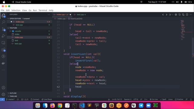 Add new node in the last position of a doubly link list | Bangla DS and Algorithm Doubly Linked List is a variation of the Linked list in which navigation is possible in both ways, either forward and backward easily as compared to Single Linked List. Following are the important terms to understand the concept of a doubly linked list. Link − Each link of a linked list can store data called an element. ------------------------------------------------------------------------ Code: https://www.codeshikhi.org/data-structure/implement-doubly-linked-list-using-oop-in-python GitHub: https://github.com/AR-Shahin/Data_Structure_and_Algorithm/blob/main/Link_list/dobley.cpp #datastructure #algorithm