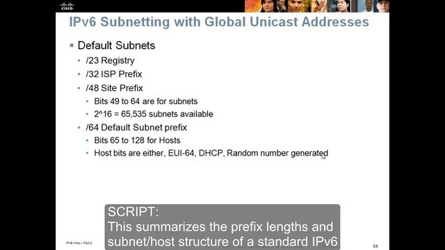 IPv6 subnetting is based on the network address assigned by the ISP and the needs of the organization to subdivide that space. In this example, The network address assigned to the organization is 2001:25:12 (the first 48 bits). The site prefix is /48 decimal and the site prefix plus subnets (ab12) is /64. IPv6 uses the same notation as CIDR in IPv4, there are no subnet masks, only a slash and a decimal number representing the number of bits in the network/subnet. In addition, there are no reserved subnet addresses (network or broadcast) with IPv6 so it is not necessary to account for the first and last address on a subnet when determining the number of valid host addresses (no more n^2 -- 2).