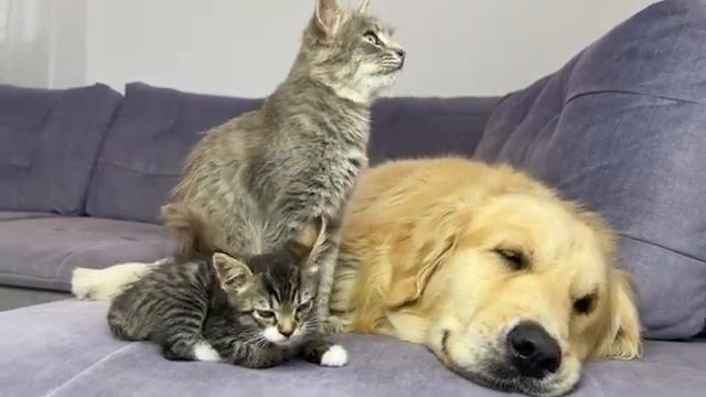 Кошка и котёнок спят с ретривером - 2025 год