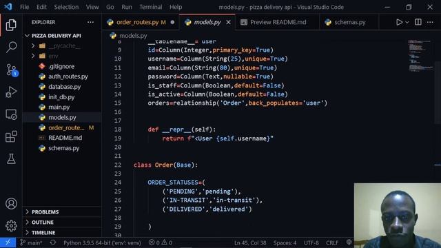 Hey guys , This is part 9 of a series of videos where we are going to build a Pizza delivery API for a Pizza delivery service. This video is intended for anyone who wants to learn how to build REST APIs with FastAPI. In this video, we create a route that enables us to get the orders of the currently logged in user. We carry out a simple get request that returns the orders made by the currently logged in user. Please like comment and subscribe to the channel. SOURCE CODE: https://github.com/jod35/Pizza-Delivery-API.git GITHUB: https://github.com/jod35 TWITTER: https://twitter.com/jod35_