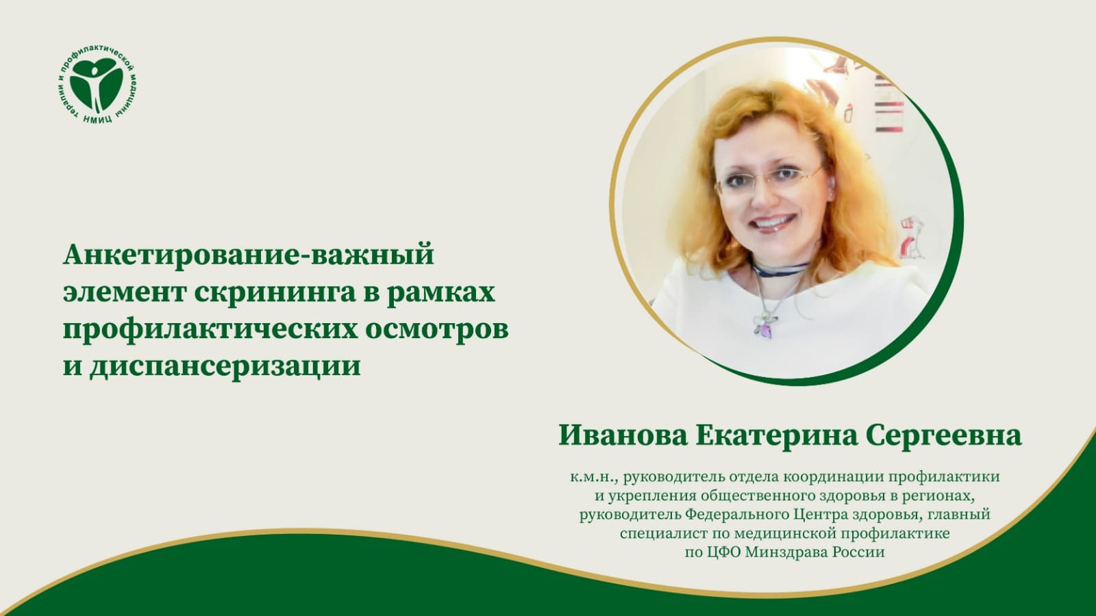 «Анкетирование-важный элемент скрининга в рамках профилактических осмотров и диспансеризации», лекция от 05.12.2023. Лектор: Иванова Екатерина Сергеевна —к.м.н., руководитель отдела координации профилактики и укрепления общественного здоровья в регионах, руководитель Федерального Центра здоровья, главный специалист по медицинской профилактике по ЦФО Минздрава России.