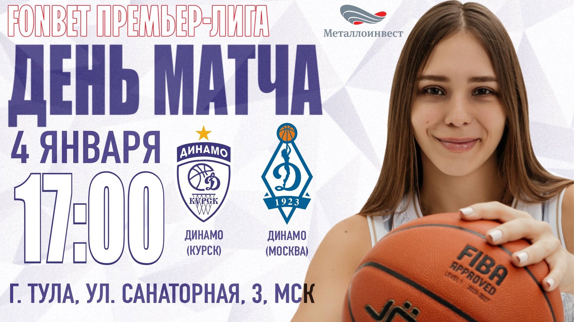 04.01.2025 17:00 Динамо (Курск) - Динамо (Москва) ФОНБЕТ ЧЕМПИОНАТ РОССИИ - ПРЕМЬЕР-ЛИГА. Регулярный чемпионат Время матча: 19:00 Арена: ТУЛА, УЛ.САНАТОРНАЯ 3, МСК Статистика: https://competitions.russiabasket.ru/premer-liga/women/game/?id=836803