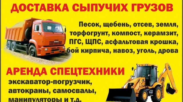 ДОСТАВКА: песок (намывной, карьерный), щебень (гранитный, известковый), отсев (гранитный, известковый), земля, торфогрунт, торф, грунт, компост, керамзит, ПГС, асфальтовая крошка, бой кирпича, уголь, дрова , навоз с доставкой самосвалами и в мешках. Вывоз строительного мусора. АРЕНДА: экскаватор-погрузчик JCB (гидромолот, ковшики). Самосвалы, автокраны, манипуляторы и т.д. СТРОИТЕЛЬСТВО: дорог, нулевой цикл, благоустройство, пирог под фундаментную плиту, пирог под тротуарную плитку, канализация под ключ, дренаж, и т.д. Ленинградская область, Гатчинский район, г. Гатчина. Тел.: 8 (921) 962-62-52, Александр. Без посредников В Интернете (в поисковиках) нас находят, в частности, по таким словам: грузоперевозки Гатчина, доставка сыпучих грузов Гатчина, сыпучие грузы Гатчина, песок Гатчина, щебень Гатчина, отсев Гатчина, земля Гатчина, торф Гатчина, грунт Гатчина, компост Гатчина, керамзит Гатчина, ПГС Гатчина, асфальтовая крошка Гатчина, уголь Гатчина, дрова Гатчина, аренда спецтехники Гатчина, спецтехника Гатчина, экскаватор погрузчик Гатчина, экскаватор Гатчина, погрузчик Гатчина, автокран Гатчина, самосвал Гатчина, манипулятор Гатчина, строительство Гатчина, строительные работы Гатчина, намывной песок Гатчина, карьерный песок Гатчина, гранитный щебень Гатчина, известковый щебень Гатчина, гранитный отсев Гатчина, известковый отсев Гатчина, торфогрунт Гатчина, бой кирпича Гатчина, вывоз мусора Гатчина, вывоз строительного мусора Гатчина, строительство дорого Гатчина, фундамент Гатчина, канализация Гатчина. #гатчина #арендаспецтехники #доставкасыпучихгрузов #грузоперевозки #экскаваторпогрузчик #строительство #канализация #вывозмусора