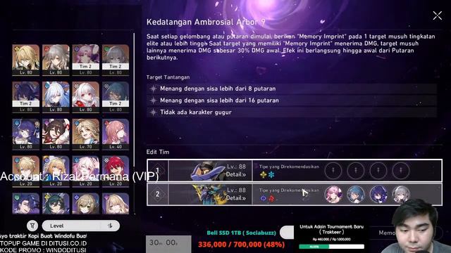 Subscribe Guys.. 3000 Subs akan ada Giveaway lagi 🔥 ========================================================== Topup Semua Game Favorit kalian, Lebih Murah dari Ingame dan Legal di https://ditusi.co.id/ Pakai Kode Promo = WINDODITUSI biar dapet Diskon Fufufu~ ========================================================== Menu Joki HSR (30 menit / Orang) Gratis : ( Jalur langit 10k Minimal ) - Simulated Universe / Swarm Disaster - Gacha - Forgotten Hall / Memory of Chaos / Xianzhou - All Chara Stat Check - Eksplore Only 1 Area - Farming Relic Nah link pendaftarannya disini ya : https://forms.gle/tyJGxRYRGLaFkWoY6 dan dibawah ini Link antriannya (Kuning sedang diproses, merah ga jadi, hijau sudah selesai) https://docs.google.com/spreadsheets/d/1jdyST1GtrQN-iUrRRlU3Q3tEblVpuCe0ifBPD8zJdlw/edit?usp=sharing BACA PERATURAN DIATAS YA... ========================================================== [Traktir/mediashare]: Dukung aku (Minimal 1000) : https://trakteer.id/windofu/link (Untuk Hadiah Next tournament ) https://sociabuzz.com/windofu/donate (Untuk Beli SSD) Ringtone : Ara-Ara Pastikan kalian Memberi dalam Kondisi seiklasnya ya... ========================================================== •Social Media - Instagram: https://www.instagram.com/windofu/ - Tiktok : https://www.tiktok.com/@windofuu - Discord : https://discord.gg/My4axm3qvd ========================================================== SUBSCRIBE DAN LIKE GUYSS !! ========================================================== {Tag } : #live #windofu #honkai #honkaistarrail #hsr #build #moc #hsrindonesia #huohuo #gacha #xueyi #indonesia #memoryofchaos #simulateduniverse #argenti #ruanmei #starrail #swarmdisaster ========================================================== [For Copyright Matter's and Paid Promotions]: Contact Email windofu30@gmail.com ========================================================== Nightbot Command : !aboutme !panggilan !donate !harapangacha !motivasi1 !absen !motivasi2 !hobi !motivasi3 !kerjaan !spec !uid !waifu Command Build Character tinggal Tambahin ! contoh = !seele Kalau mau rekomendasi Lightcone tinggal tambahin lc, contoh = !lcseele list karakter = silverwolf | mcphysical | yanqing | bailu | herta | sampo | gepard | pela | natasha | qingque | march7 | tingyun | sushang | jingyuan | bronya | hook | mcfire | clara | welt | asta | danheng | seele | serval | himeko