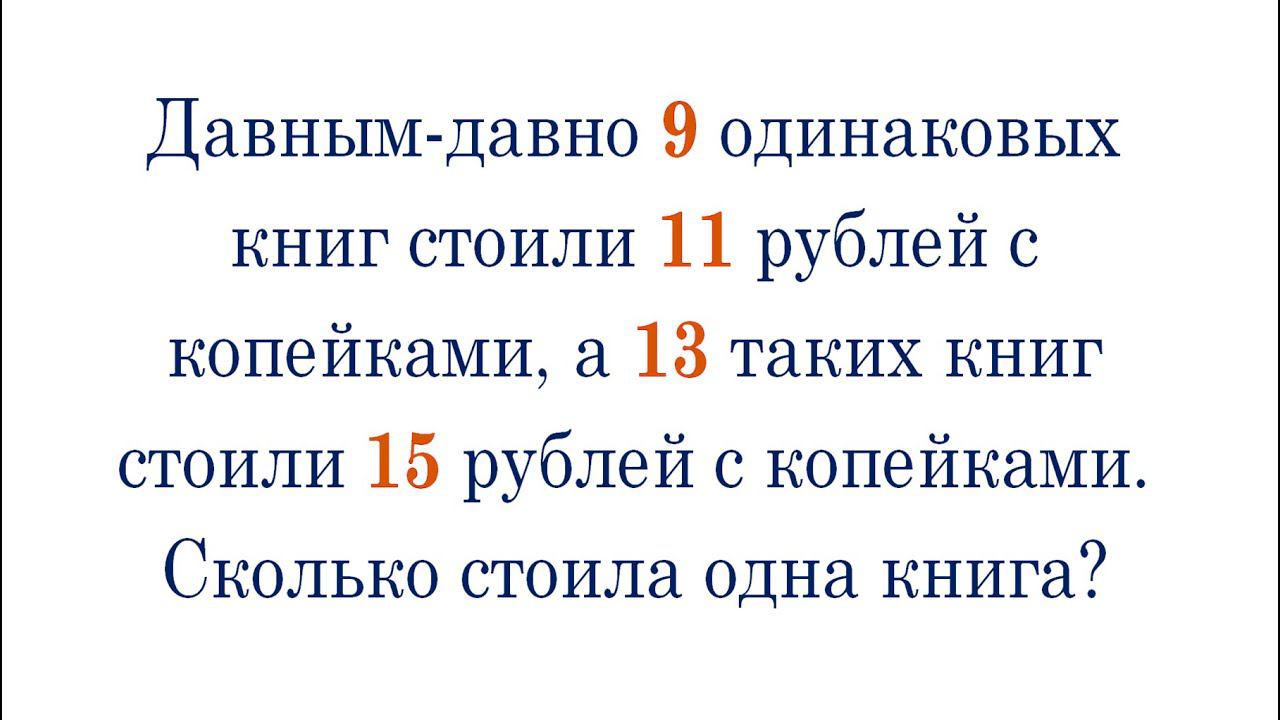 Давным-давно 9 одинаковых книг стоили 11 рублей с копейками, а 13 таких книг стоили 15 рублей с копейками. Сколько стоила одна книга? Олимпиадная задача от Горбачева Н. В. Предыдущее видео: https://youtu.be/Tg4f2OrQXsA Valery Volkov https://www.youtube.com/valeryvolkov @arinablog наш семейный канал https://www.youtube.com/channel/UCktJn2SW0NzKaLkdfsYqnrg Почта: uroki64@mail.ru