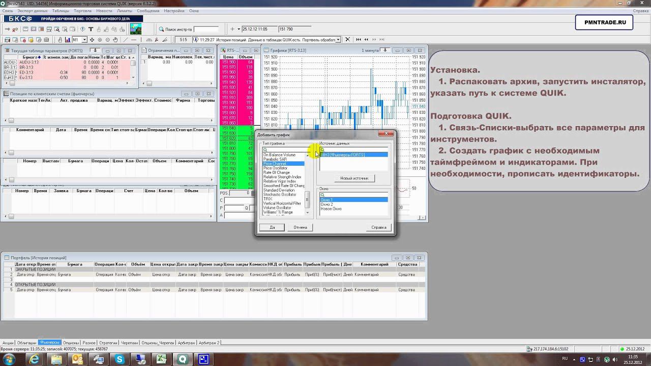 Страница программы: http://pmntrade.ru/robot_price_channel.html Утилита для QUIK "Робот Канал цены". Простейший трендовый торговый робот для QUIK. Рекомендуется всем трейдерам, желающим автоматизировать торговые процессы. - простая и визуально понятная трендовая система - возможность торговли инструментами всех групп: акции, облигации, фьючерсы, опционы - возможность использования нескольких копий портфеля на одном инструменте - возможность использования нескольких копий портфеля на разных инструментах - возможность торговли в одну сторону: покупку или продажу - возможность использования для входа в позицию без стопа - программа для бэктестинга «Тестер Канал цены» в комплекте - открытый код с описанием всех функций вплоть до каждой строки Внимание! Утилита работает только совместно с портфелем "История позиций".
