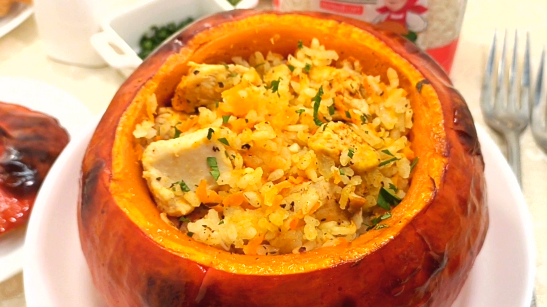 Тыква, фаршированная рисом и курицей, в духовке