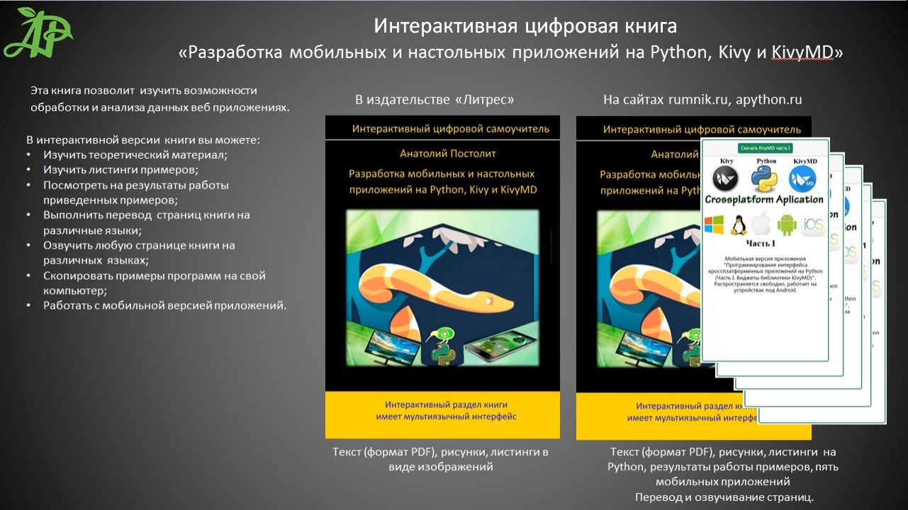 Интерактивная цифровая книга, в которой описана технология создания мобильных и настольных приложений на Python. Такие приложения могут работать на любых устройствах под любыми операционными системами (персональный компьютер, ноутбук, планшет, смартфон). Из книги можно скачать листинги примеров и использовать их в своих проектах. Мобильные версии приложений можно скачать с сайта "Академия Python" (apython.ru), и затем выполнять их на смартфоне.