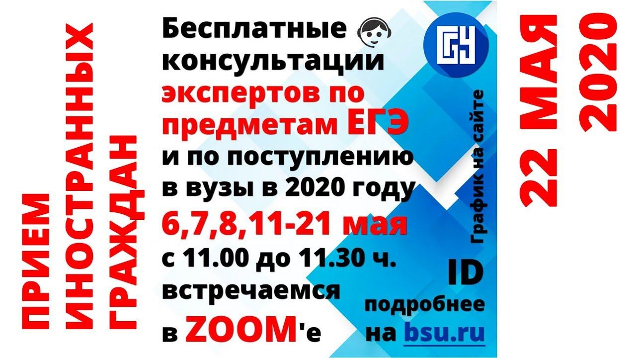 Уважаемые выпускники, их родители и классные руководители! С 6 по 21 мая пройдут бесплатные онлайн-консультации для учеников старших классов по всей России. 11 ведущих экспертов ЕГЭ проведут для вас консультации по всем общеобразовательным предметам, расскажут, как избежать ошибок и не потерять баллы. Ответственный секретарь Приемной комиссии БГУ даст подробную инструкцию, как будет проходить Приемная кампания-2020: что ждет абитуриентов, как в этом году подавать документы, какие существуют льготы, что такое конкурс, в какие даты будет проходить зачисление и многое другое. Консультации будут проходить на платформе ZOOM, присоединиться можно по ссылке https://us02web.zoom.us/j/9976663333 через ПК, планшет или телефон. Также будет вестись прямая трансляция с записью на канале "LifeBsu" в ютубе. Идентификатор конференции 997 666 3333 без пароля Начало консультаций в 11.00 согласно представленному графику. График онлайн-консультаций с экспертами по предметам ЕГЭ и по поступлению в вузы в 2020 году в новости по ссылке http://www.bsu.ru/news/22973/