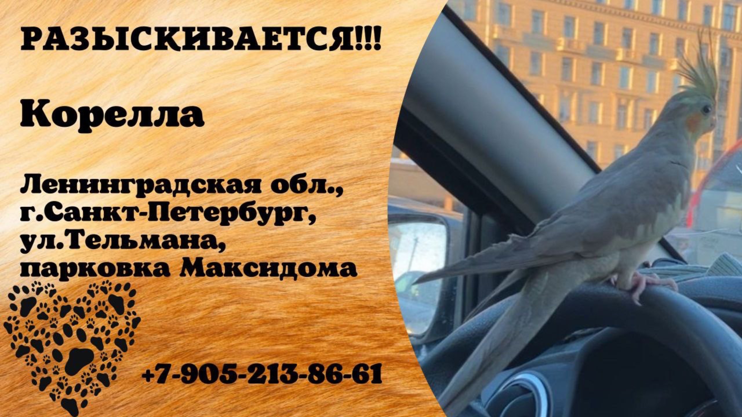 Ленинградская Санкт-Петербург Пропал попугай 5.04 с парковки Максидома «ул. Тельмана, 31» около 6-ти вечера улетел попугай корелла. Ручной, серенький. Недалеко станция метро улица Дыбенко. Нашедшим огромная просьба связаться по номеру +7 (905) 213 86-61. За вознаграждение! Инфо https://vk.com/wall-198815410_188483 #пропал_попугай#ленинградская #Санкт_Петербург#корелла