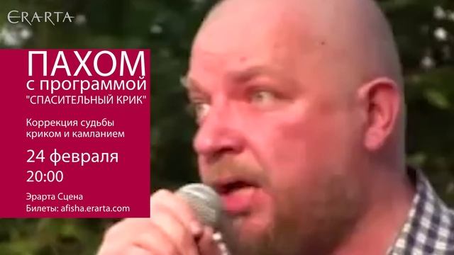 24 февраля 2016 г. на Эрарта Сцене с программой «Спасительный крик» выступит Пахом — один из самых интригующих персонажей современного арт-мира и просто незаурядная личность. Впервые в Петербурге! Подробности и билеты онлайн http://www.erarta.com/ru/calendar/events/detail/6e2d249c-c0f9-11e5-b7ad-8920284aa333/