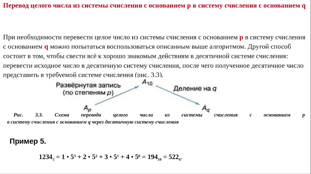 Для перевода целого десятичного числа в систему счисления с основанием q следует: 1) последовательно выполнять деление данного числа и получаемых целых частных на основание новой системы счисления до тех пор, пока не получится частное, равное нулю; 2) полученные остатки, являющиеся цифрами числа в новой системе счисления, привести в соответствие алфавиту новой системы счисления; 3) составить число в новой системе счисления, записывая его, начиная с последнего остатка. Вопросы и задания: 1. Переведите целые числа из десятичной системы счисления в двоичную систему счисления: 1) 1025; 2) 512; 3) 600. 2. Переведите целое число 1147 из десятичной системы счисления в системы счисления: 1) пятеричную; 2) восьмеричную; 3) шестнадцатеричную. 3. Переведите двоичные числа в восьмеричную систему счисления: 1) 1010001001011; 2) 1010,00100101. 4. Переведите двоичные числа в шестнадцатеричную систему счисления: 1) 1010001001011; 2) 1010,00100101. 5. Переведите числа в двоичную систему счисления: 1) 2668; 2) 26616. 6. Переведите числа из восьмеричной системы счисления в шестнадцатеричную: 1) 12754; 2) 1515. 7. Переведите числа из шестнадцатеричной системы счисления в восьмеричную: 1) 1АЕ2; 2) 1С1С. 8. Сравните числа: 1) 12516 и 1111000101012; 2) 7578 и 11100101012; 3) А2316 и 12328. 9. Сколько из чисел С, записанных в двоичной системе счисления, удовлетворяет неравенству 2218 меньше С меньше 9516? Какие числа? 1) 100101002; 2) 100101102; 3) 100100112; 4) 100011002. 10. Сколько значащих нулей в двоичной записи: 1) восьмеричного числа 2501; 2) шестнадцатеричного числа 12А? 11. Среди четырёхзначных восьмеричных чисел, двоичная запись которых содержит ровно 5 единиц, найдите: 1) наименьшее число; 2) наибольшее число. 12. Среди трёхзначных шестнадцатеричных чисел, двоичная запись которых содержит ровно 7 нулей, найдите: 1) наименьшее число; 2) наибольшее число. 13. Все 5-буквенные слова, составленные из букв О, П, Р, Т, записаны в алфавитном порядке и пронумерованы. Вот начало списка: 1. ООООО 2. ООООП 3. ООООР 4. ООООТ 5. ОООПО Какие слова находятся в этом списке на 531-м и 787-м местах? 14. Укажите через запятую в порядке возрастания все основания систем счисления, в которых запись десятичного числа 82 оканчивается на 5.