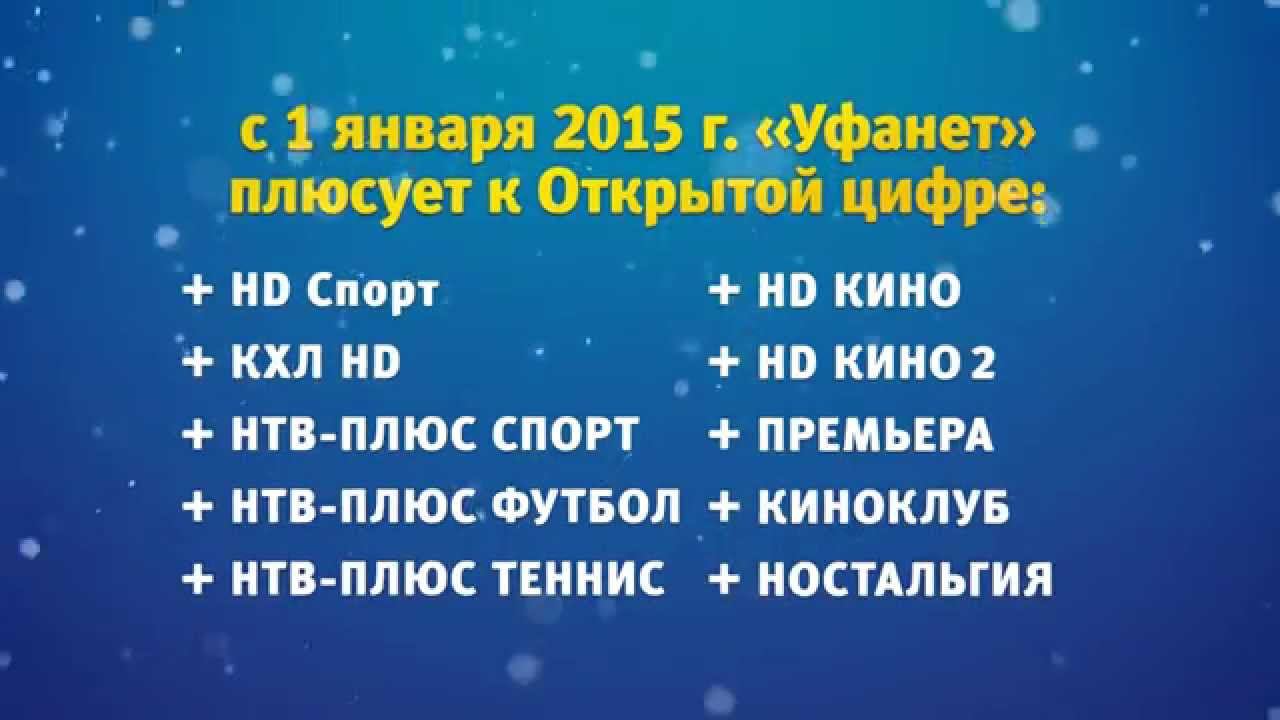 Компания Уфанет поздравляет своих абонентов с Новым годом и с 1 января 2015 года добавляет к Открытой цифре 10 премиальных каналов без повышения абонентской платы: HD Кино, Премьера, КХЛ HD и другие. КРУТАЯ ОТКРЫТАЯ ЦИФРА ОТ УФАНЕТ! Полная информация на сайте ufanet.ru. #уфанет #открытаяцифра