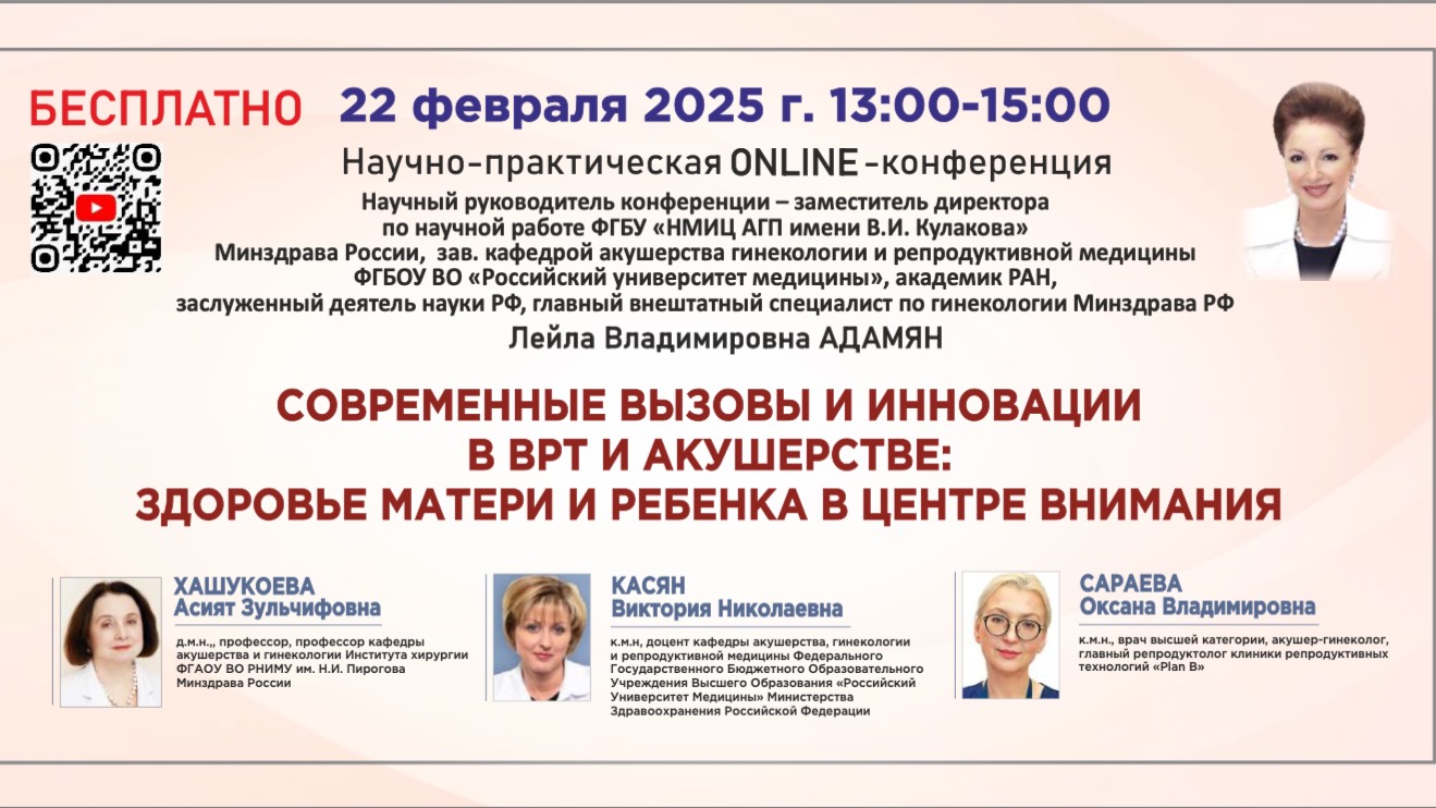 Научно-практическая онлайн конференция: Современные вызовы и инновации в ВРТ и акушерстве: здоровье матери и ребенка в центре внимания Материнство – один из важнейших аспектов социальной реализации женщины и ее семейного благополучия. И это благополучие является приоритетом для нашего здравоохранения в условиях непростой демографической ситуации. Каждая беременность – это вклад в будущее нации, ее здоровье. В настоящее время медицина обладает широким спектром диагностических, профилактических и лечебных стратегий для того, чтобы беременность состоялась, женщина выносила и родила здорового ребенка. Учитывая экологическую обстановку, откладывание первых и последующих родов на более поздний возраст, важно на этапе планирования оценить возможные осложнения и использовать максимально эффективные способы профилактики и лечения осложнений. Грамотная реабилитация после репродуктивных неудач, сопровождение женщины в случае, если необходимы вспомогательные репродуктивные технологии, ведение беременности после ВРТ – все эти вопросы мы обсудим на сегодняшней конференции. Научный руководитель конференции: АДАМЯН Лейла Владимировна Заместитель директора ФГБУ «НМИЦ акушерства, гинекологии и перинатологии имени В.И. Кулакова» Минздрава России, зав. кафедрой репродуктивной медицины и хирургии ФГБОУ ВО «Российский университет медицины», академик РАН, заслуженный деятель науки РФ, главный внештатный специалист по гинекологии Минздрава РФ Спикеры: ХАШУКОЕВА Асият Зульчифовна - д.м.н., профессор, профессор кафедры акушерства и гинекологии Института хирургии ФГАОУ ВО РНИМУ им. Н.И. Пирогова Минздрава России КАСЯН Виктория Николаевна – к.м.н, доцент кафедры акушерства, гинекологии и репродуктивной медицины Федерального Государственного Бюджетного Образовательного Учреждения Высшего Образования «Российский Университет Медицины» Министерства Здравоохранения Российской Федерации САРАЕВА Оксана Владимировна – к.м.н., врач высшей категории, акушер-гинеколог, главный репродуктолог клиники репродуктивных технологий «Plan B» Программа конференции: 1) "РАННИЕ СРОКИ БЕРЕМЕННОСТИ. ОТ ФАКТОРОВ РИСКА НЕВЫНАШИВАНИЯ К ПРЕВЕНТИВНОЙ МЕДИЦИНЕ" ( ХАШУКОЕВА Асият Зульчифовна ) 2) "РЕАБИЛИТАЦИЯ ПРИ ПОТЕРЯХ БЕРЕМЕННОСТИ И НЕУДАЧАХ ЭКО" ( КАСЯН Виктория Николаевна ) 3) "КОГДА НАЧИНАЕТСЯ И ЗАКАНЧИВАЕТСЯ ЗГТ ПРИ БЕРЕМЕННОСТИ В ПРОТОКОЛАХ ЭКО" ( САРАЕВА Оксана Владимировна ) «Дискуссия. Ответы на вопросы» Адамян Л.В., Хашукоева А.З., Касян В.Н., Сараева О.В.