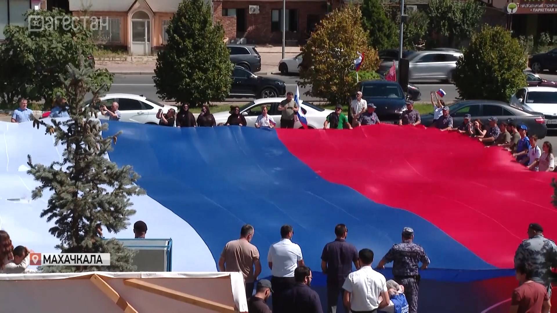 Там развернули 20-ти метровый российский триколор. Так в Махачкале празднуют День государственного флага. Волонтеры раздавали жителям ленты в цветах российского флага, флажки и информационные буклеты об истории главного государственного символа. Также в рамках акции более 20 машин присоединились к патриотическому автопробегу. Автомобили украсили государственной символикой.