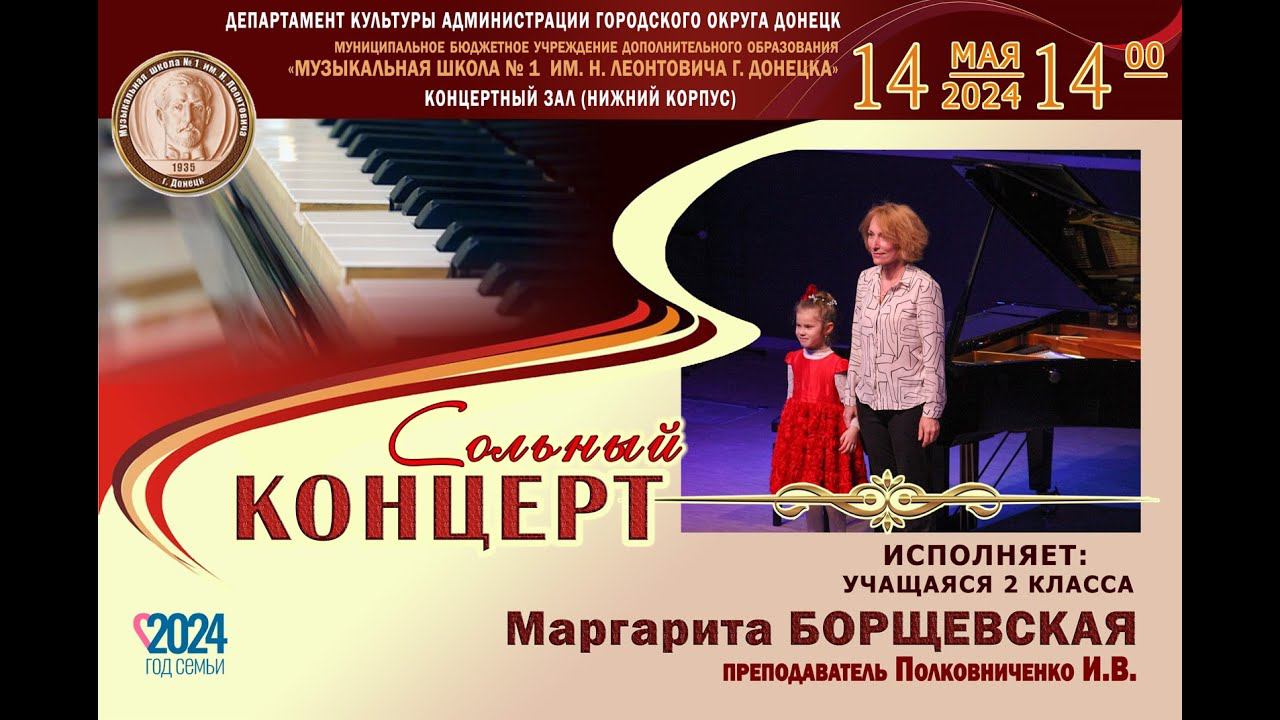 14 мая в Концертном зале Музыкальной школы № 1 им. Н. Леонтовича г. Донецка состоялся сольный концерт учащейся 2 класса Фортепианного отдела Маргариты БОРЩЕВСКОЙ, класс преподавателя Полковниченко Ирины Владимировны. Приятного просмотра! #Год_Семьи 14 мая 2024 года