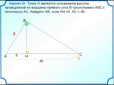 Точка Н является основанием высоты, проведённой из вершины прямого угла В треугольника ABC к гипотенузе АС. Найдите АВ, если AH =5, АС = 45. Высота прямоугольного треугольника, проведённая к гипотенузе, делит её на отрезки 3 и 27. Найдите площадь треугольника.