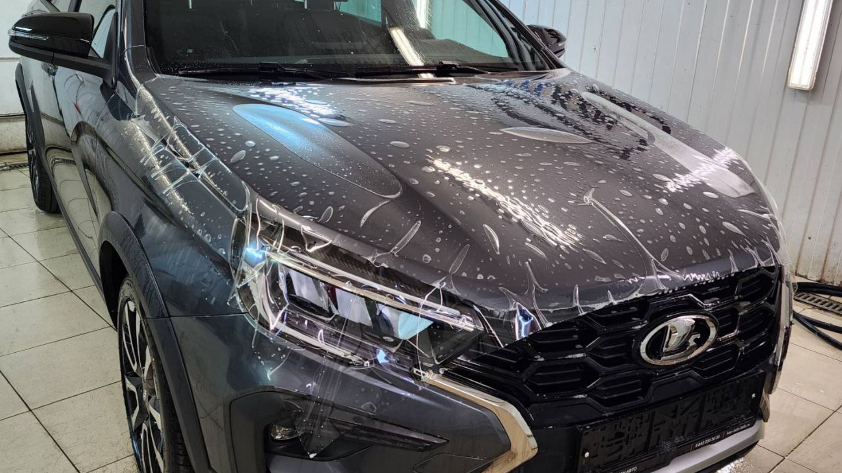 Lada Vesta - бронирование прозрачной полиуретановой плёнкой капота, фар, часть крыши и под ручками