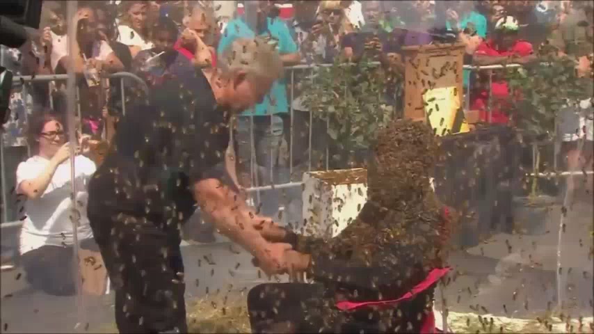 Житель Канады поверг прохожих в дикое изумление, целый час просидев со 100 тысячами пчёл на голове. Насекомые настолько плотно облепили лицо мужчины, что на видео не видно ни его глаз, ни рта, ни носа. Сделав такой трюк, канадец не только установил мировой рекорд, но и засветился в рекламе. А его коллега рассказал, как ему удалось привлечь такое количество пчёл.